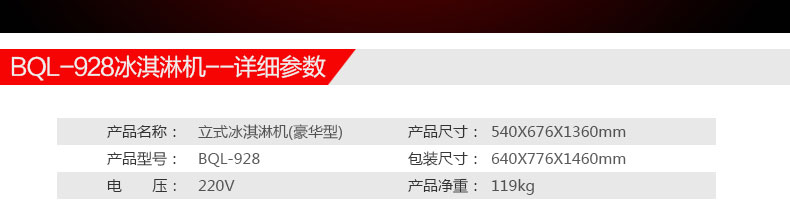 BQL-928立式冰淇淋機,1.選用國際牌壓縮機,輔以旭眾精湛工藝,大大縮短冰淇淋成型時間,高效節能;2.全新液晶智能觸控面板,簡單明了,多功能易操作;3.全新升級專業膨化泵,膨化率高,產量增加30%;4.一鍵清洗功能,省時方便;5.主要部件采用不銹鋼材質,時尚美觀,持久耐用;6.先進的機械攪拌系統,機器運行穩定可靠,低噪音,產品口感爽滑細嫩。