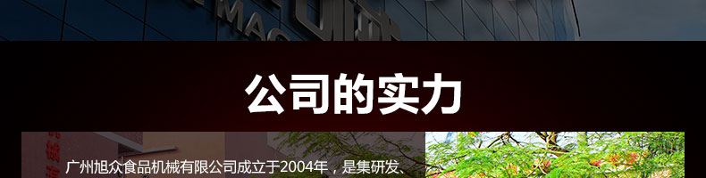 廣州旭眾食品機械有限公司是一家集科研開發,生產設計,營銷服務為一體的現代化生產企業。現代化生產車間,精湛制造技術,所產機械歷經市場重重考驗,不斷贏得海內外客戶的贊譽。