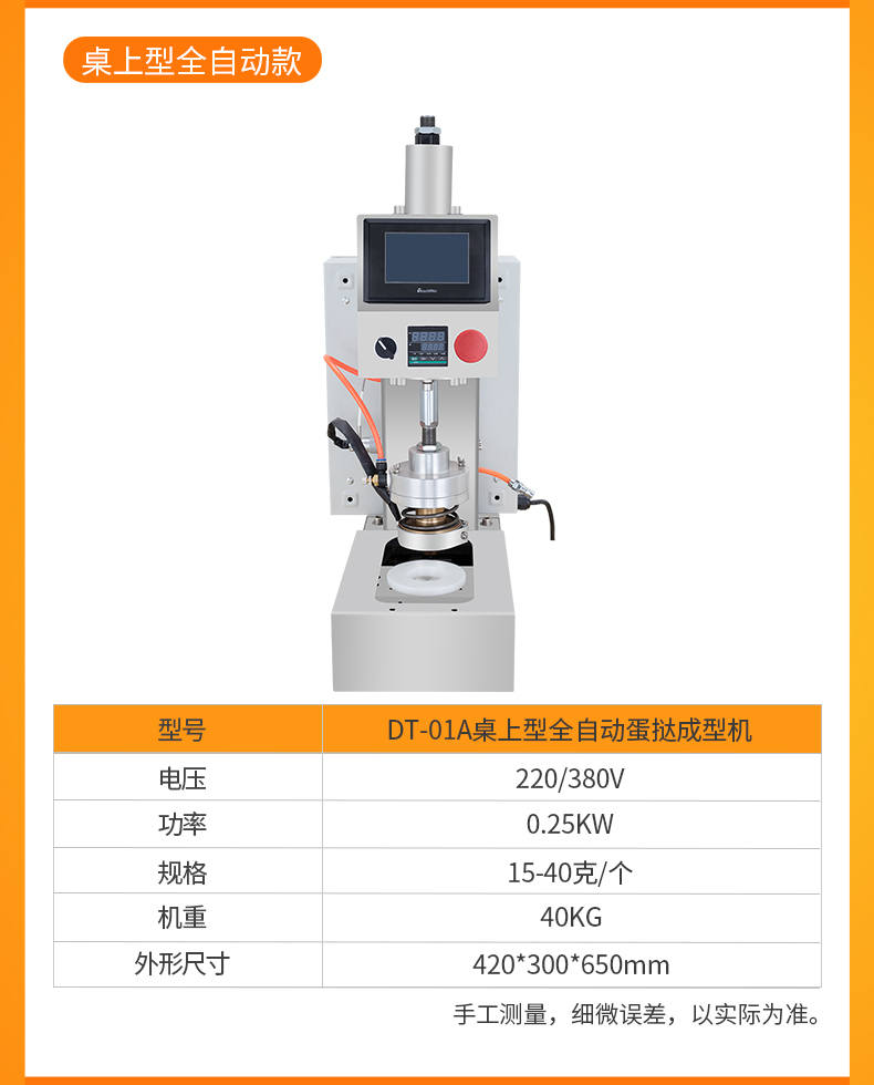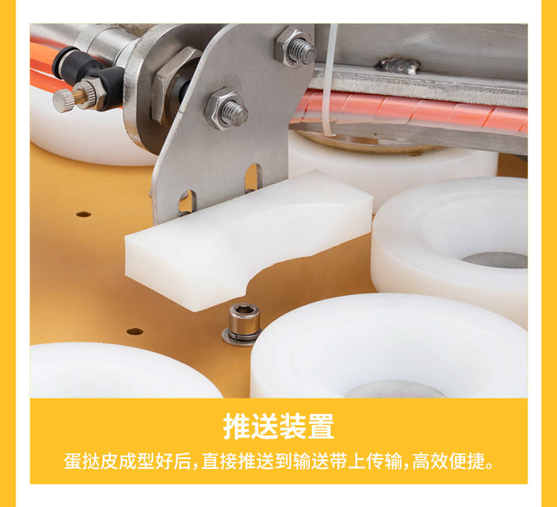 DT-04全自動蛋撻成型機,2-3秒快速成型。該機應用于傳統蛋撻、葡式蛋撻及其它須印型之產品突破傳統用手捏,采用微電子控制成型,一個2-3秒,高效率。大小均勻一次成型按鍵操作簡單準確,成型效果好,厚薄均勻,大小統-。層層起酥層次分明好葡式蛋撻皮,千層酥皮、松脆可口、唇齒留香、一口難忘。