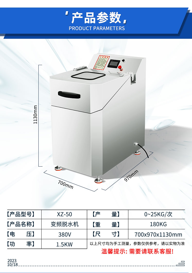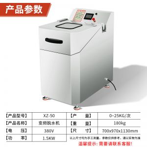 XZ-50型脫水機,蔬菜脫水食品甩干,變頻控制、方便快捷。速度調頻,脫水速度可根據不同產品需求調節不同速度。鈑金機身,機架鈑金是 2MM 厚,使整機運行時更穩定,噪音更小。