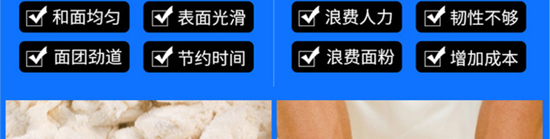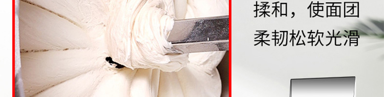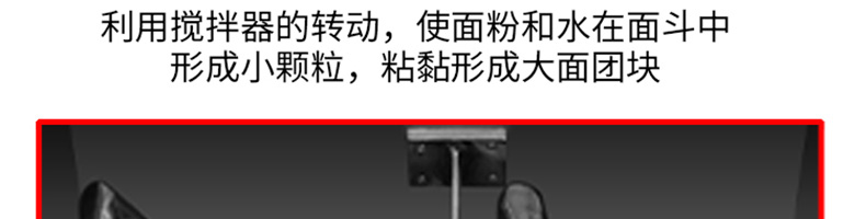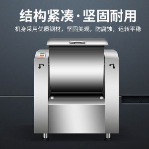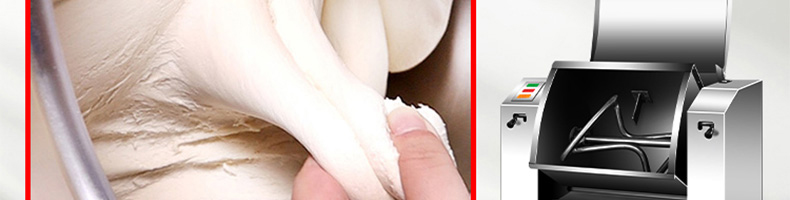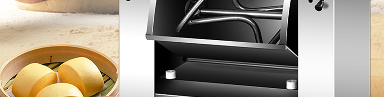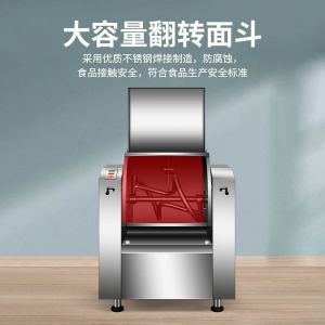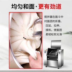 低噪音和面機,利用攪拌器的轉動,使面粉和水在面斗中形成小顆粒,粘黏形成大面團塊。大容量翻轉面斗,采用優質不銹鋼焊接制造,防腐蝕,食品接觸安全,符合食品生產安全標準。