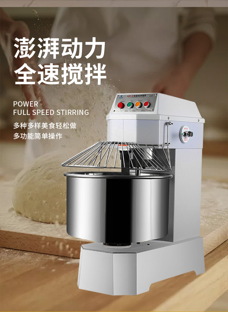 SZH-50型雙速雙動和面機,本機適合攪拌各種面包、包子、饅頭、湯圓、披薩餅面團,專業設計避免面團過分升溫并確保面團含氧量。過載、缺相保護裝置,防護罩安全連動裝置。