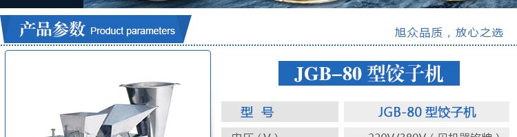 JGB-80型號餃子機,本機是一款可生產各種肉餡、肉菜混合餡、全菜餡及其他種餡餃子的設備。包制出來的餃子可蒸、煮、炸、煎等多種調理。適用于賓館、飯店、餐廳、團體食堂加工,幼兒園、速凍餃子生產。