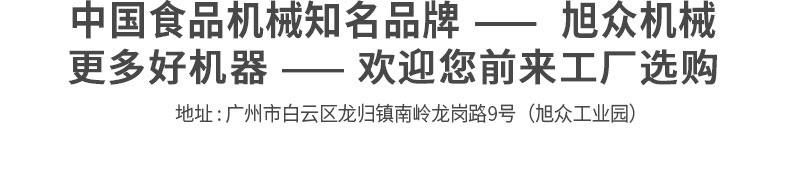 廣州旭眾食品機械有限公司是一家集科研開發,生產設計,營銷服務為一體的現代化生產企業。現代化生產車間,精湛制造技術,所產機械歷經市場重重考驗,不斷贏得海內外客戶的贊譽。