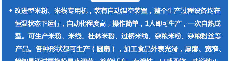 SZ-300多功能米粉機,生產(chǎn)多樣性可生產(chǎn)米粉、米線、粉絲、粉條、、年糕、玉米面條、各種雜糧粉絲、各種面條、雜糧面條、彩色面條以及以紅薯、玉米、大豆、蠶豆等制成淀粉為原料的等多種食品而且每種食品厚薄、粗細等規(guī)格可根據(jù)需要任意調(diào)整。