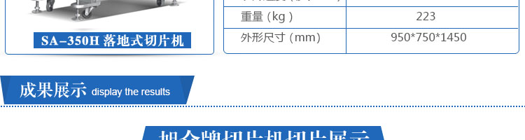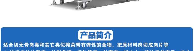 SA-350H 全自動落地式切片機,適合切無骨肉類和其他類似榨菜帶有彈性的食物,把原材料肉切成肉片,并可自動成卷狀。可切牛肉片、羊肉片等