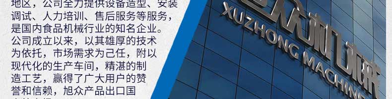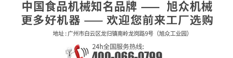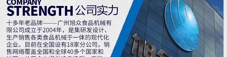廣州旭眾食品機械有限公司是一家集科研開發(fā),生產設計,營銷服務為一體的現(xiàn)代化生產企業(yè)。現(xiàn)代化生產車間,精湛制造技術,所產機械歷經市場重重考驗,不斷贏得海內外客戶的贊譽。