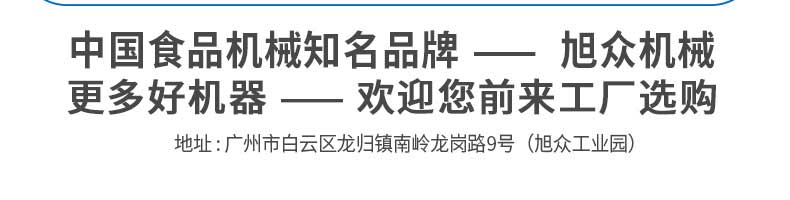 廣州旭眾食品機械有限公司是一家集科研開發,生產設計,營銷服務為一體的現代化生產企業。現代化生產車間,精湛制造技術,所產機械歷經市場重重考驗,不斷贏得海內外客戶的贊譽。