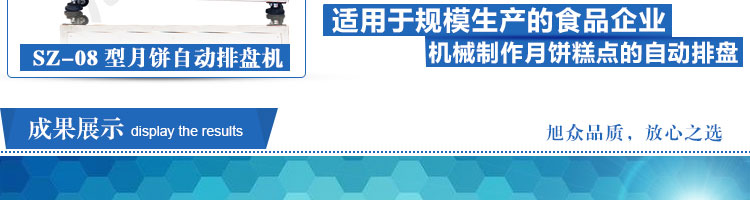 SZ-08型月餅自動排盤機,可同于制作各種月餅。適用于蛋糕房、休閑食品廠、食品加工產、面包房、月餅加工廠、超市、學校、食堂等各種工作場所。可滿足不同客戶群體。免費提供工藝技術。