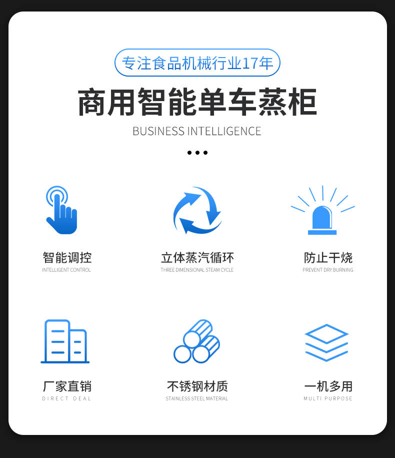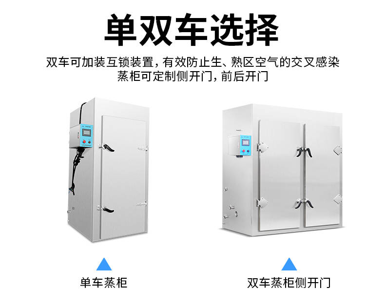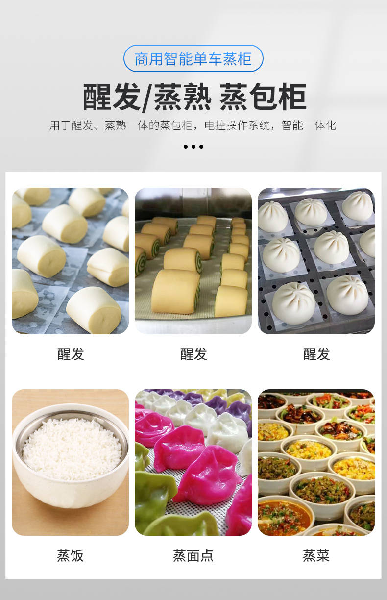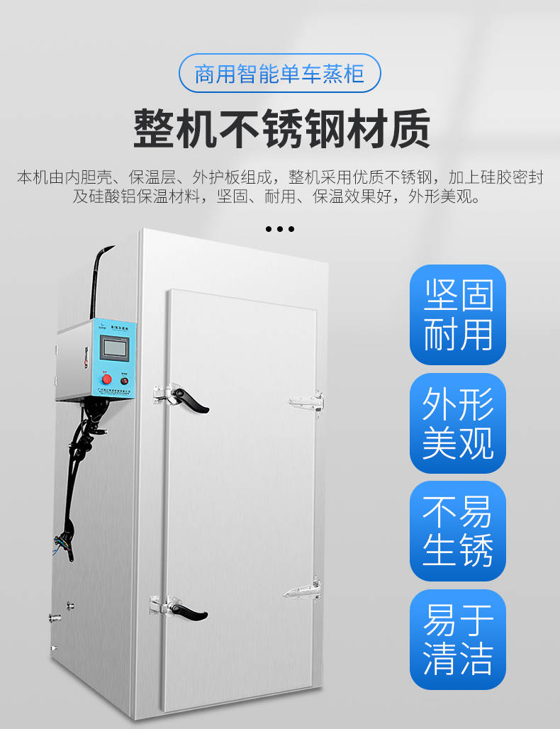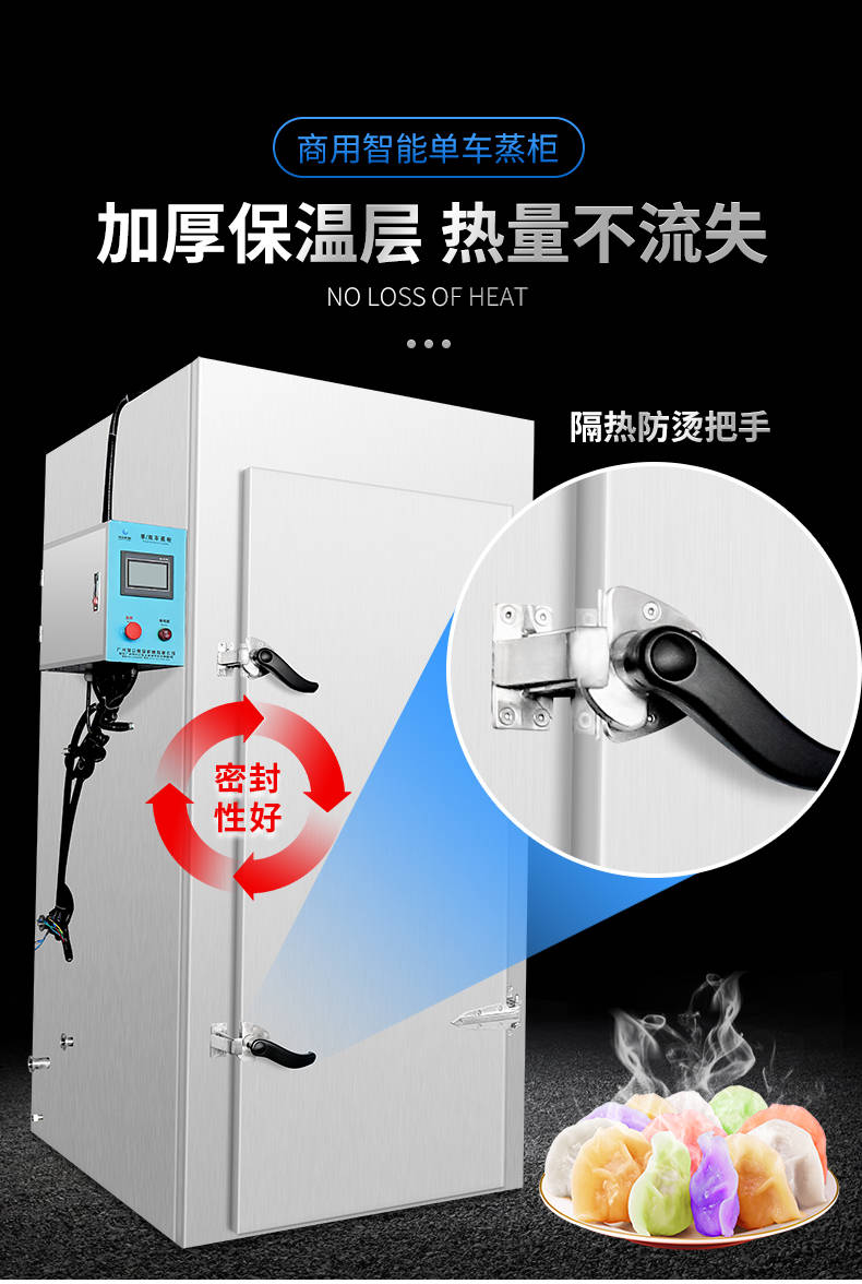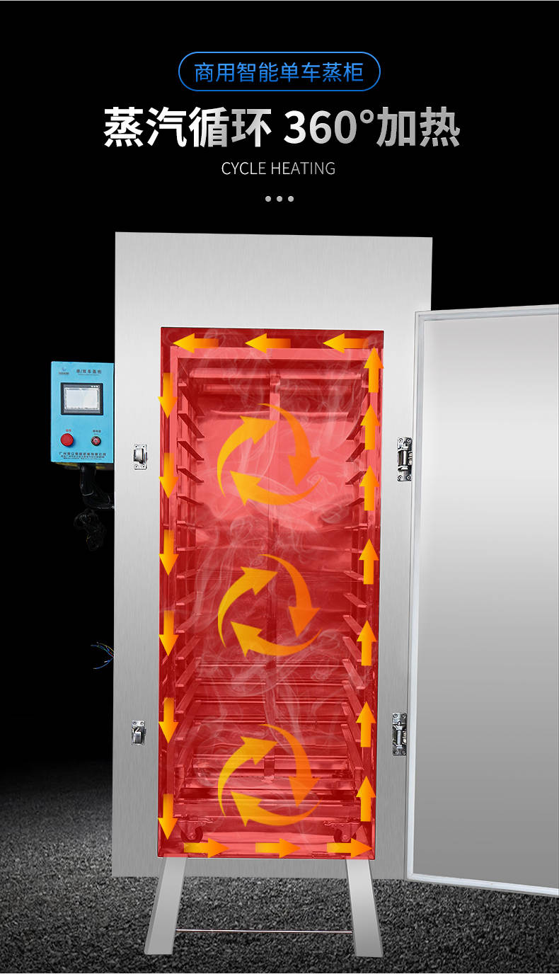 單車蒸柜,整機不銹鋼材質本機由內膽殼、保溫層、外護板組成,整機采用優質不銹鋼,加上硅膠密封及硅酸鋁保溫材料,堅固、耐用、保溫效果好,外形美觀。循環均勻發熱,專門用于發熱管干燒空氣,溫度任意調節,讓食物口感怡到好吃